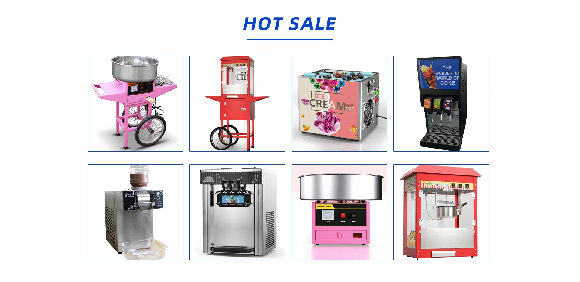 Productos principales:Máquina de palomitas de maíz, máquina de rollos de helado, máquina de algodón de azúcar, máquina de helados, dispensador de bebidas